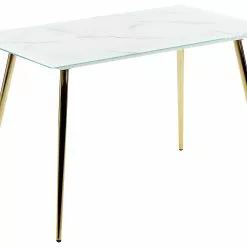 Een stijlvolle tafel laat elke maaltijd lekkerder smaken – met deze tafel garandeer je niet alleen lekkere maaltijden, maar ook een opvallend middelpunt van je eetkamer. De tafel is gemaakt van hoogwaardig gehard glas en roestvrij staal en heeft een prachtige kleuren combinatie van wit met een glanzend marmer effect en slanke gouden poten. Door het formaat is deze tafel perfect voor kleinere kamers en geeft hij toch ruimte voor 4 personen.
