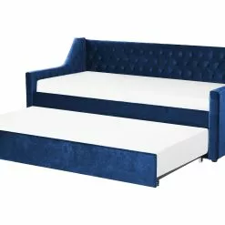 Of het nu gaat om een retro, glamoureuze of traditionele setting, dit uitschuifbed is een prachtige aanvulling op elke kamer. Het solide, duurzame frame is op maat gemaakt van zacht aanvoelend fluweel, wat het een hoogwaardige, elegante uitstraling geeft. De lage armleuningen en gecapitonneerde rugleuning benadrukken het klassieke ontwerp van het meubel. Uitgerust met twee lattenbodems, is het bed een garantie voor een gezonde en ongestoorde slaap.